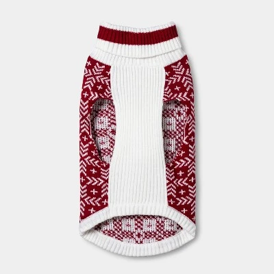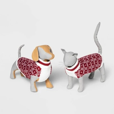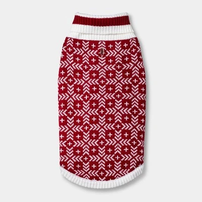 Dress your pet up in fun, wintry style with this Dog and Cat Sweater from Wondershop™. Made from soft acrylic fabric to keep them nice and cozy, this sweater is designed in red with a contrasting white geometric print. With a pullover style that makes for easy dressing, your furry best friend is sure to stay warm and look their best for the holidays!